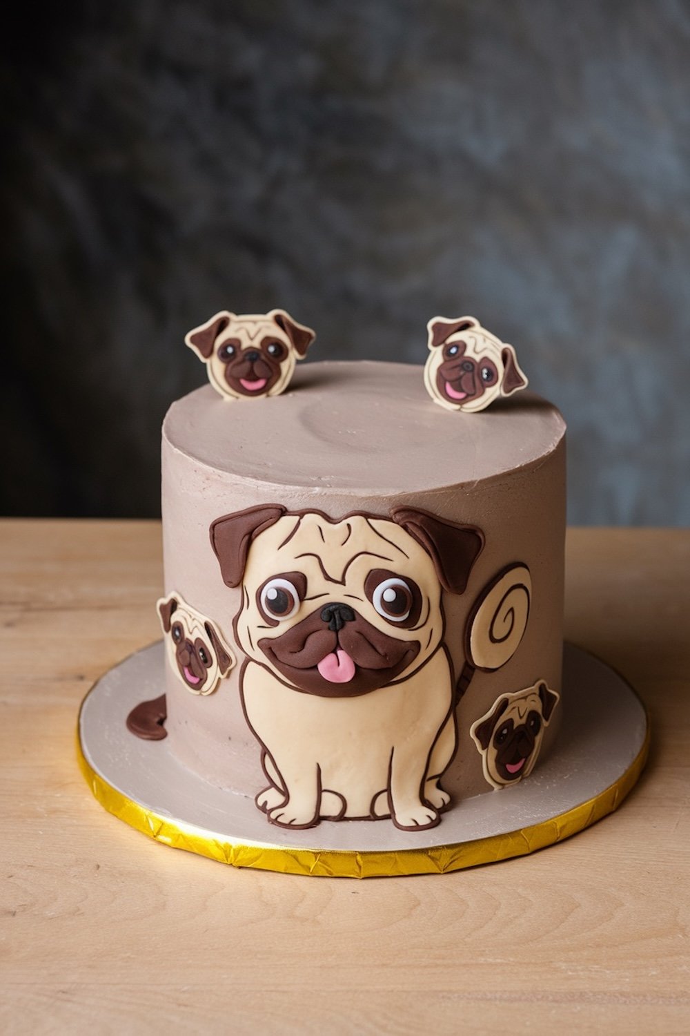 This is a cute, fun pug-themed cake for one of the most loved breeds of dogs. This cake is literally a stunner with the face of a Pug done in fondant—big and expressive, with that classic curly tail. The minimal design is in neutrals, but because of the adorable pug faces around it, the whole thing is made joyful and whimsical. This cake fits the bill perfectly for a birthday bash or simply as a sweet surprise for Pug admirers, capturing that cute factor in this playful breed perfectly.