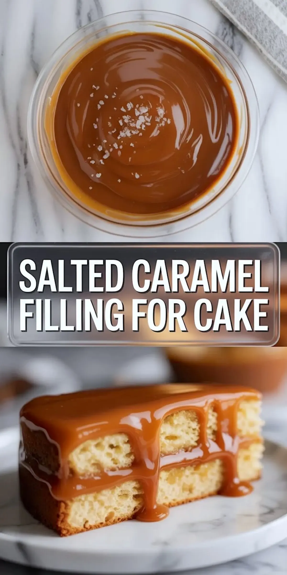 This salted caramel filling is a thick, spoonable layer made from sugar, butter, and cream. It holds between cake layers, sets without sliding, and brings deep caramel flavor with just the right touch of salt. You can use it in a salted caramel cake, pipe it into filled cupcakes, or swirl it into other caramel desserts. It works especially well in any caramel cake recipe where structure and flavor matter equally.