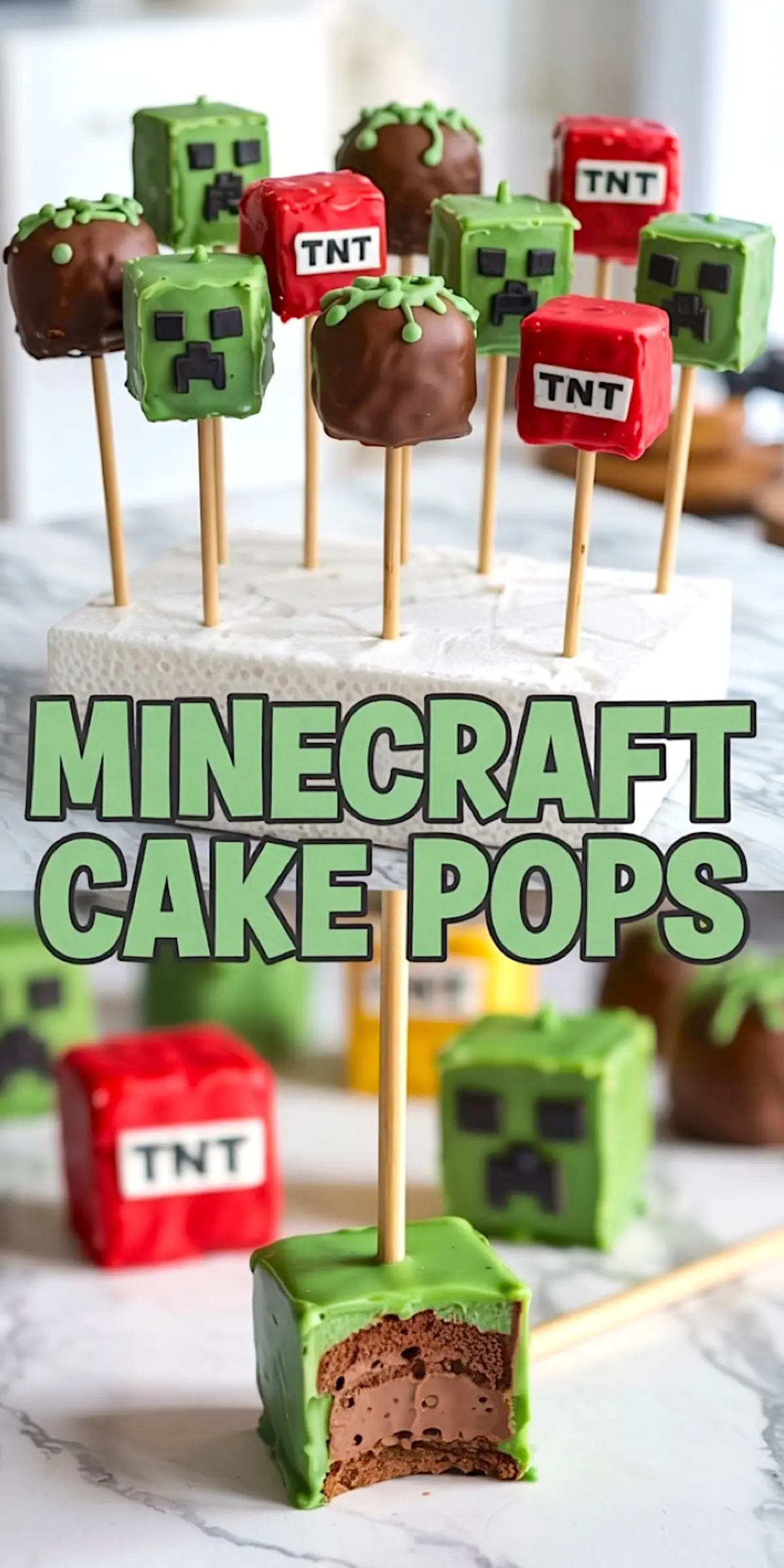 - DECORATE WITH FONDANT: To make a Creeper face, roll out green fondant and cover the top of the pop. Cut small rectangles from black fondant for the eyes and mouth and attach with edible glue or a damp brush. For a TNT block, cover the pop in red fondant and add a white fondant strip across the middle. Write or stick black fondant letters spelling “TNT” on the strip. For a grass block, cover the bottom in brown fondant and the top in green fondant, letting it slightly overhang the sides. Use a knife or modeling tool to create pixel-like texture lines. Use molds or templates for clean, consistent details if desired.