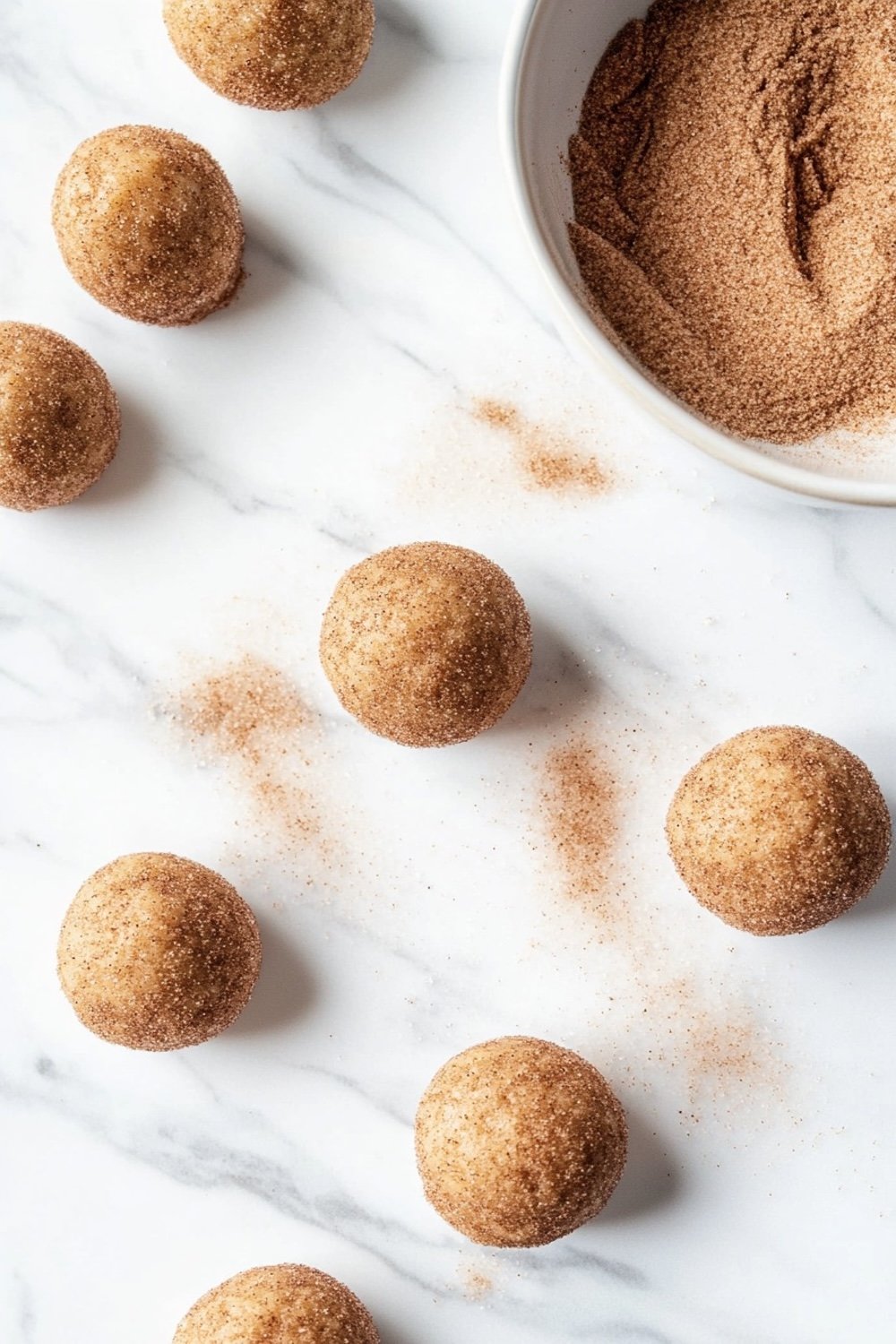 Rolling and Baking: - Coat the Cookies: In a small bowl, mix the 1/4 cup of sugar and 2 teaspoons of cinnamon together. Roll each dough ball in the cinnamon-sugar mixture until fully coated.
