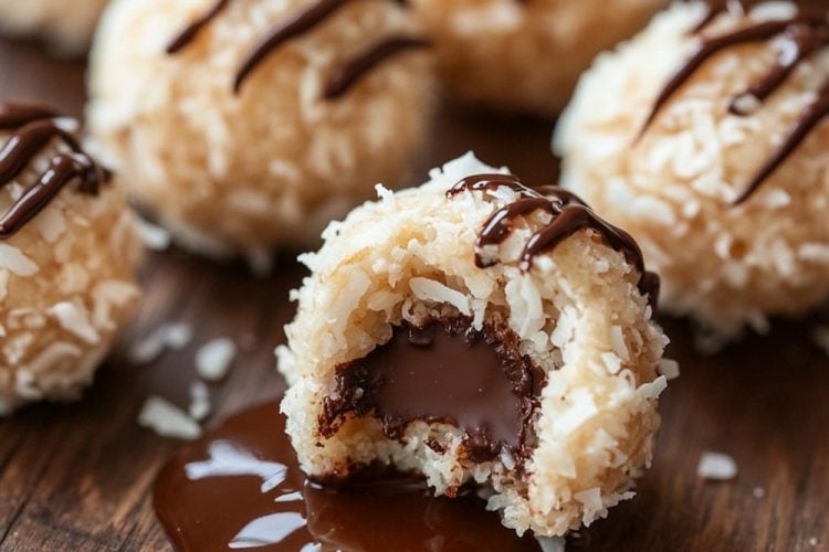 - Shape the Cookie Balls: Take a small amount of the coconut mixture (about a tablespoon) and flatten it slightly in your hand. Place a chocolate truffle or bonbon in the center, then carefully fold the coconut mixture around it, rolling it into a ball. Ensure that the chocolate is completely enclosed by the coconut. Repeat this process with the remaining coconut mixture and chocolate truffles.