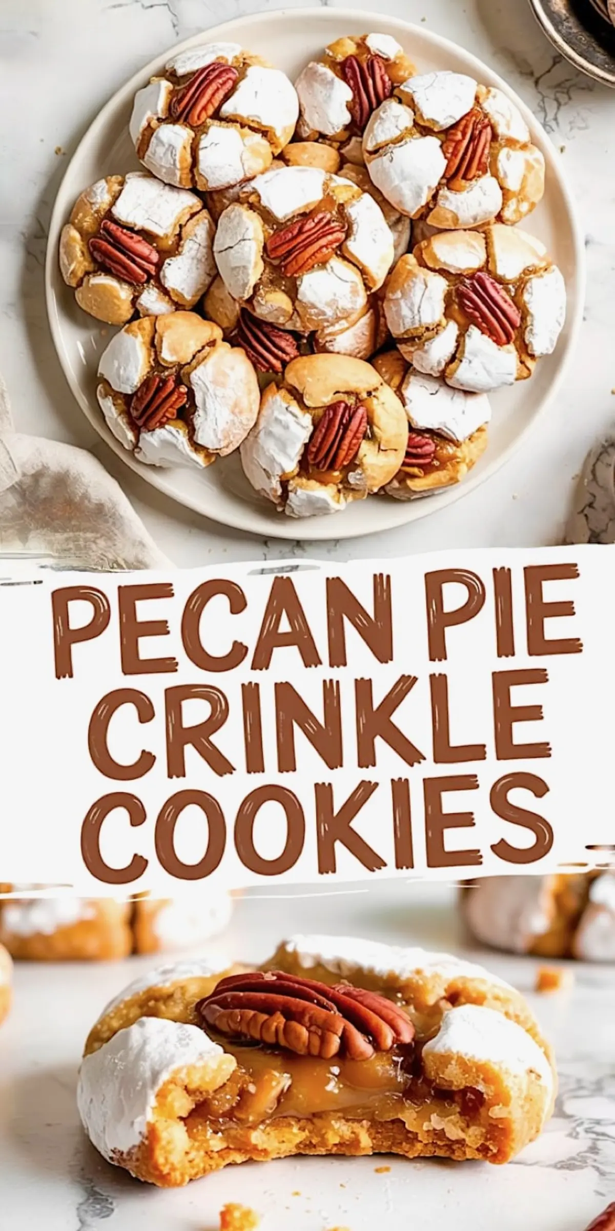 These pecan pie crinkle cookies bring together the classic flavors of a traditional pecan pie with the chewy texture and crinkly powdered sugar coating of a crinkle cookie. Each cookie is filled with a buttery, caramelized pecan center and topped with a crisp pecan half. They are easy to portion, share, and pack with seasonal flavor in every bite.