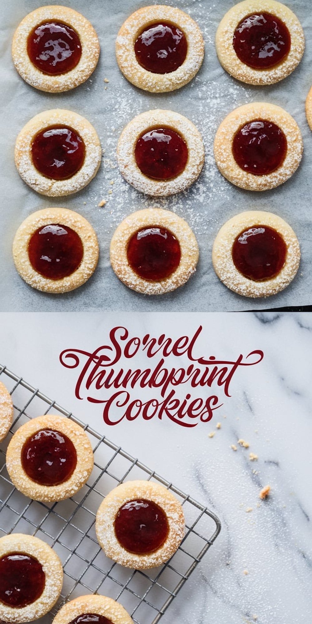 Sorrel Thumbprint Cookies feature a buttery, tender shortbread base with a center filled with sorrel jam made from dried hibiscus petals, warm spices, and fresh ginger. The cookies are lightly sweetened and perfectly balanced by the tart, spiced jam. Optional powdered sugar adds a delicate touch, making these cookies both flavorful and visually appealing.
