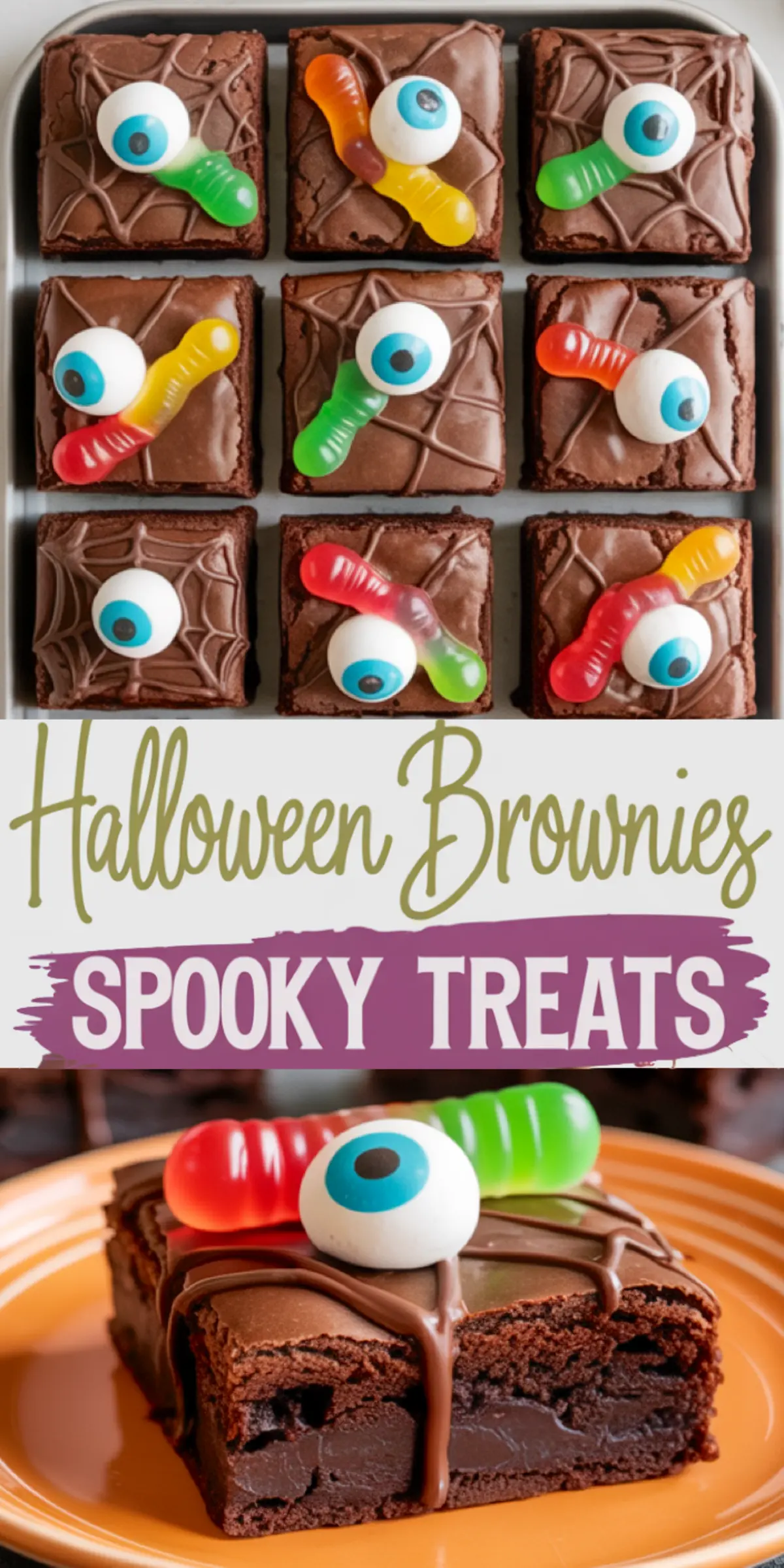 A rich, fudgy brownie base decorated with chocolate spiderwebs, gummy worms, and candy eyeballs for a playful Halloween treat that’s as fun to make as it is to eat.