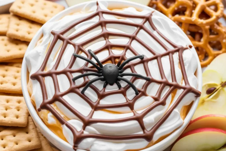 Halloween dip with a creamy base and a chocolate spiderweb design. This festive dessert pairs perfectly with apple slices, pretzels, or graham crackers and makes a fun centerpiece for a Halloween table.