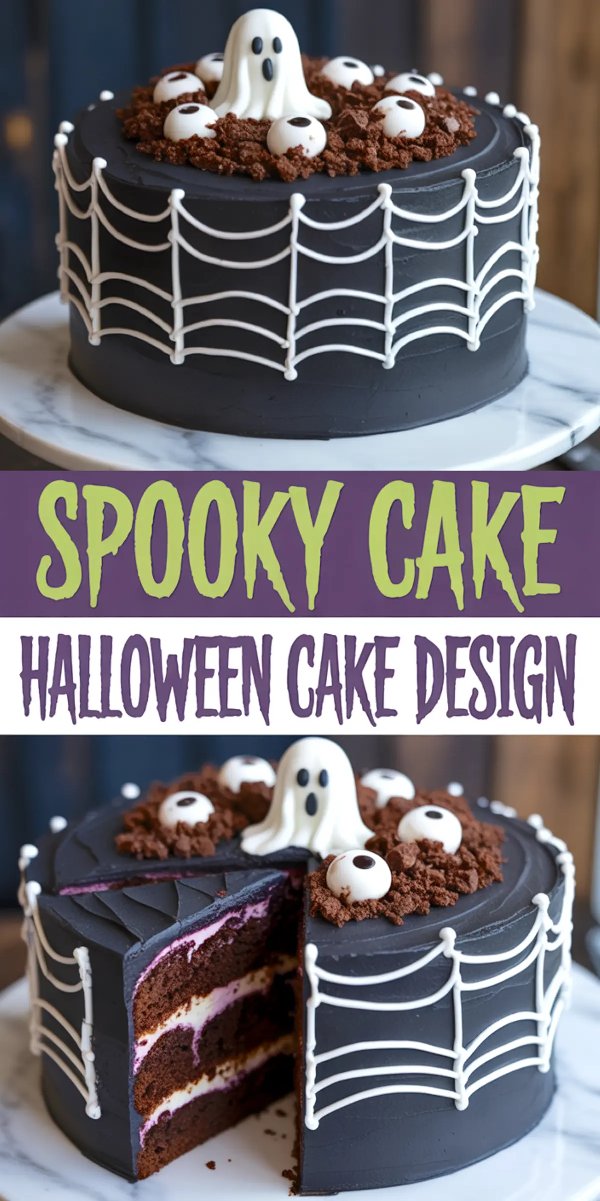 Decorations bring the cake to life. A fondant ghost in the center, white chocolate eyeballs set into cookie crumbs, and piped spiderwebs add the spooky detail. I like to keep the arrangement balanced, with the ghost as the focal point and the eyeballs circling like watchful eyes.