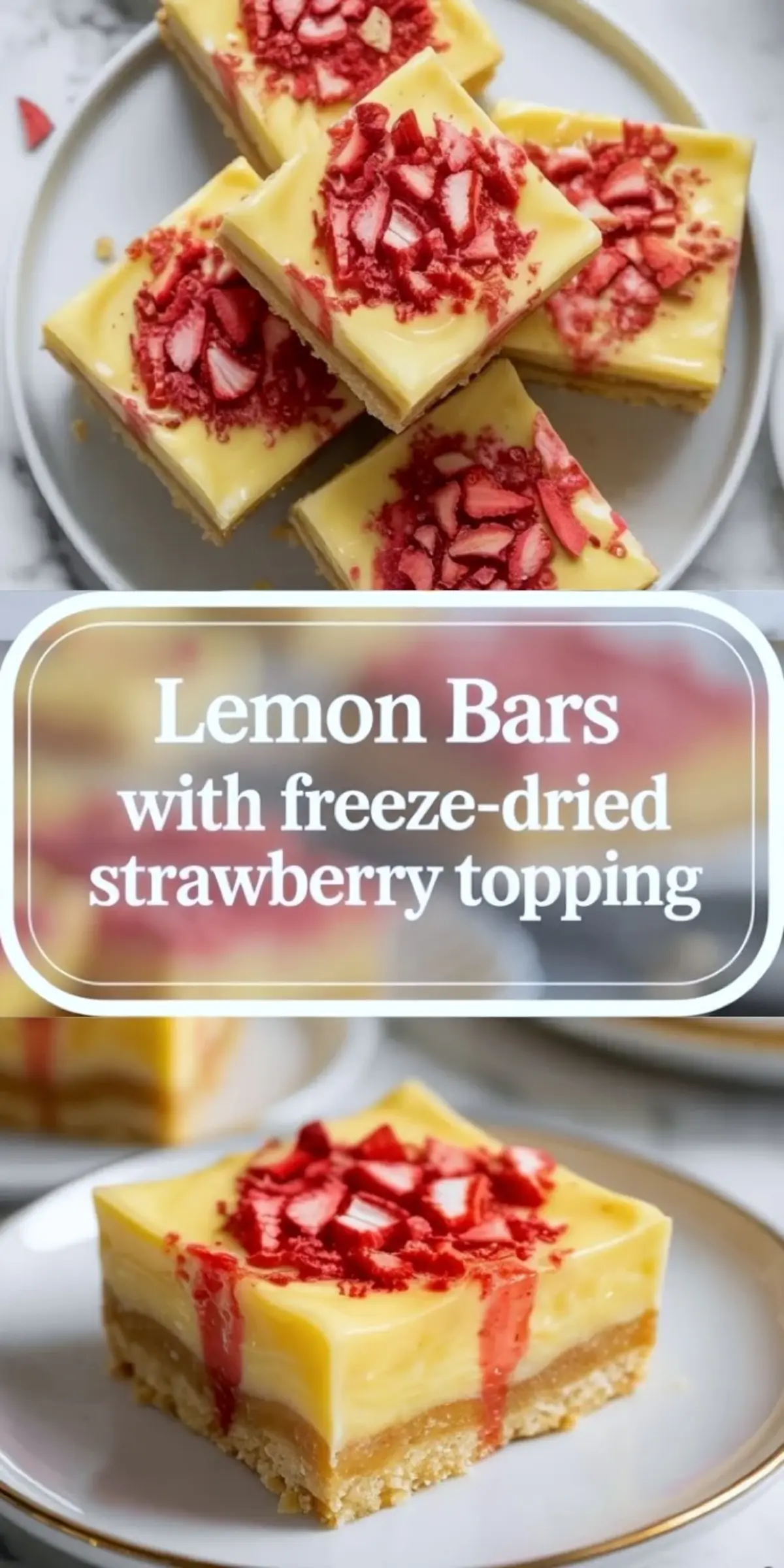 Store them covered in the refrigerator and add the freeze-dried strawberry topping close to serving time if you want to keep every piece looking crisp. Save this lemon bars recipe for the next time you want a citrus dessert that feels classic at its core but a little fresher on the tray.