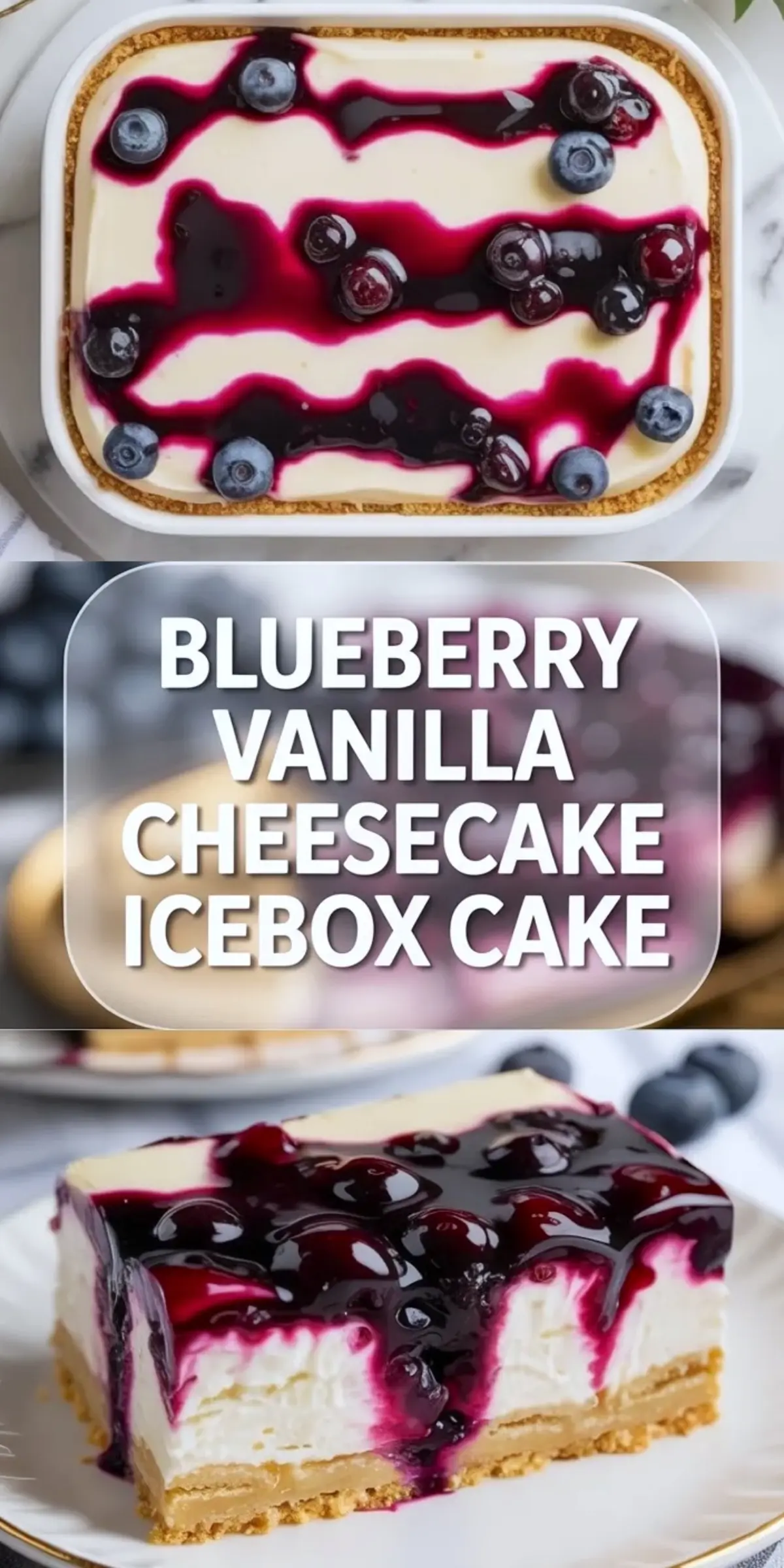 Save this Blueberry Vanilla Cheesecake Icebox Cake when you want a chilled dessert that looks polished, slices cleanly, and still stays firmly in the easy no bake category. It layers a buttery graham cracker crust, a soft vanilla cheesecake filling, and a glossy blueberry topping that gives every slice real contrast instead of turning the whole pan into one flat creamy note. If you love blueberry cheesecake icebox cake, blueberry icebox cake, and no bake blueberry cheesecake dessert recipes that feel especially right for spring and summer, this one is worth keeping because the texture stays creamy while the finished slices still look tidy on the plate. The vanilla layer keeps the flavor classic, the blueberry topping brings brightness and color, and the graham base adds the crumbly texture