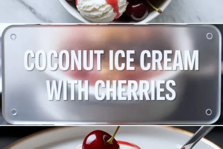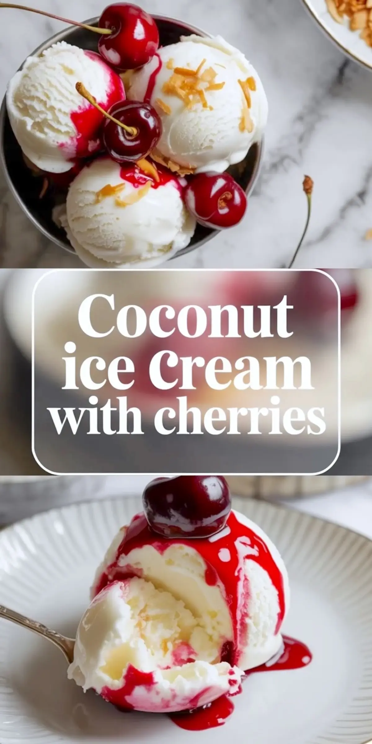 Serve the scoops cold with the cherry sauce spooned over the top and a little toasted coconut if you want more texture. The red fruit over the pale coconut ice cream makes the bowl look lively fast, which is part of why this works so well for summer dessert tables and casual dinners.
