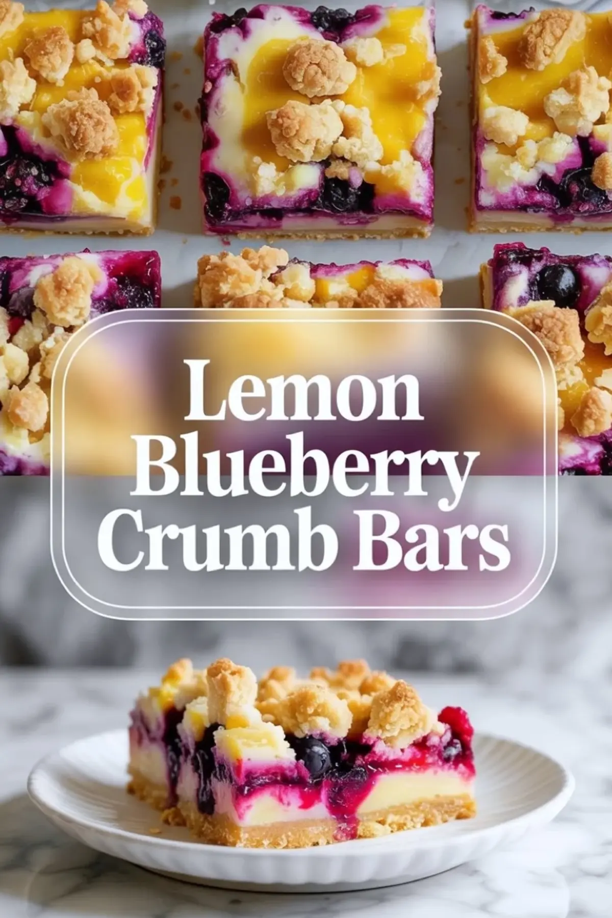 Save these lemon blueberry crumb bars when you want a bright baked bar dessert that feels creamy, fruity, and easy to slice for sharing. They layer a buttery crust with smooth lemon filling, pockets of juicy blueberries, and a crumb topping that gives the bars more texture than standard lemon bars or blueberry pie bars. The flavor lands between lemon blueberry bars, blueberry shortbread bars, and a soft fruit cheesecake square, but the lemon keeps everything sharper and fresher. If you want lemon blueberry crumb bars that look colorful on a dessert tray and hold their shape well after chilling, this recipe is a strong one to keep for spring and summer baking.