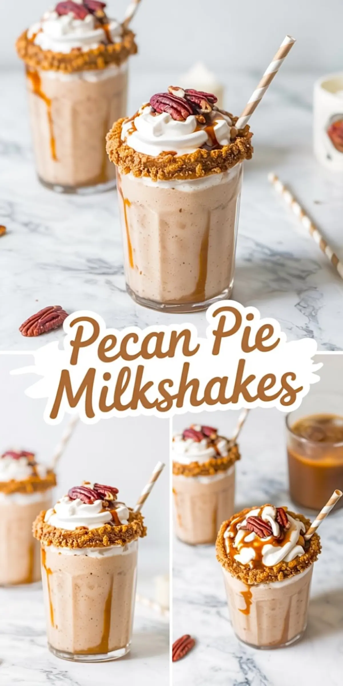A pecan pie milkshake blends the rich flavors of toasted pecans, brown sugar, vanilla, and cinnamon with creamy vanilla ice cream. A caramel-dipped, biscuit-crusted rim adds a crisp, buttery contrast, creating a milkshake that mimics the full pie experience in a glass. Optional additions like a slice of pecan pie and a caramel swirl take it a step further.
