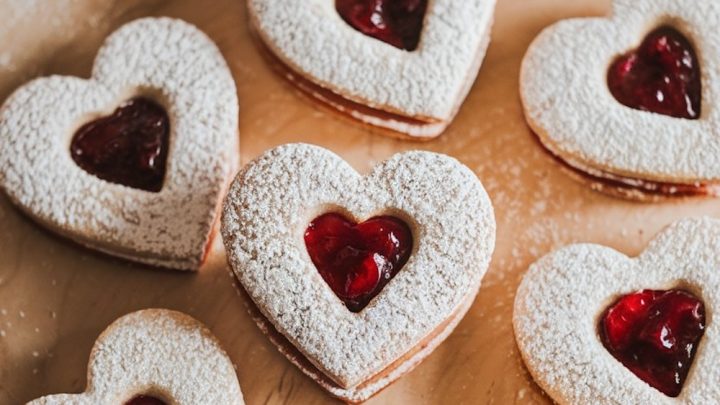 Cherry linzer heart cookies offer a jam-filled approach to valentines cookies. Two tender cookie layers sandwich a cherry jam center, and the heart-shaped cutout reveals the filling. Powdered sugar on top forms a light veil, making these cookies look sweetly nostalgic. I have fond memories baking them with my mom on chilly afternoons.